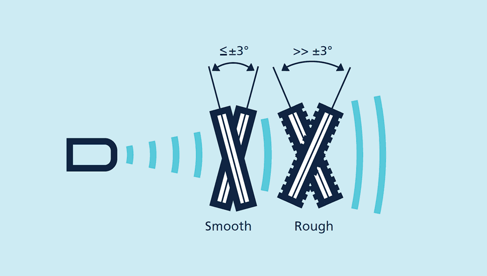 另一方面,粗糙的表面可以用更大的角度偏差》±3°来安装。对于超声波传感器来说,如果物体表面的最高点和最低点之间的距离大于或等于该频率超声波的波长,那么物体表面可认为是粗糙的。